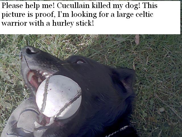 Ah Mandy.... You and your crazy flailing fore limbs! Here you are wrapped around a traditional Irish hurley, with a traditional Irish Sliotar in your mouth. Posing rathar well too!