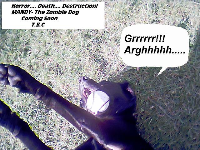Right!.... Before i explain the picture i might as well explain who Mandy is! Mandy a.k.a Quindy, is MY dog! A bit eccentric for a dog but I still love her! This picture was taken with my digital camera in the back garden of my house. During a shooting spree I managed to capture her with a very definite pose as a zombie! ( the out-stretched, stiff arms give it away) Hence the name, Mandy; the Zombie dog!